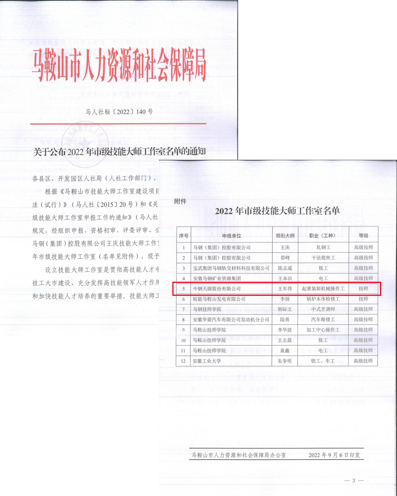 中鋼天源王軍偉技能大師工作室獲市級認(rèn)定