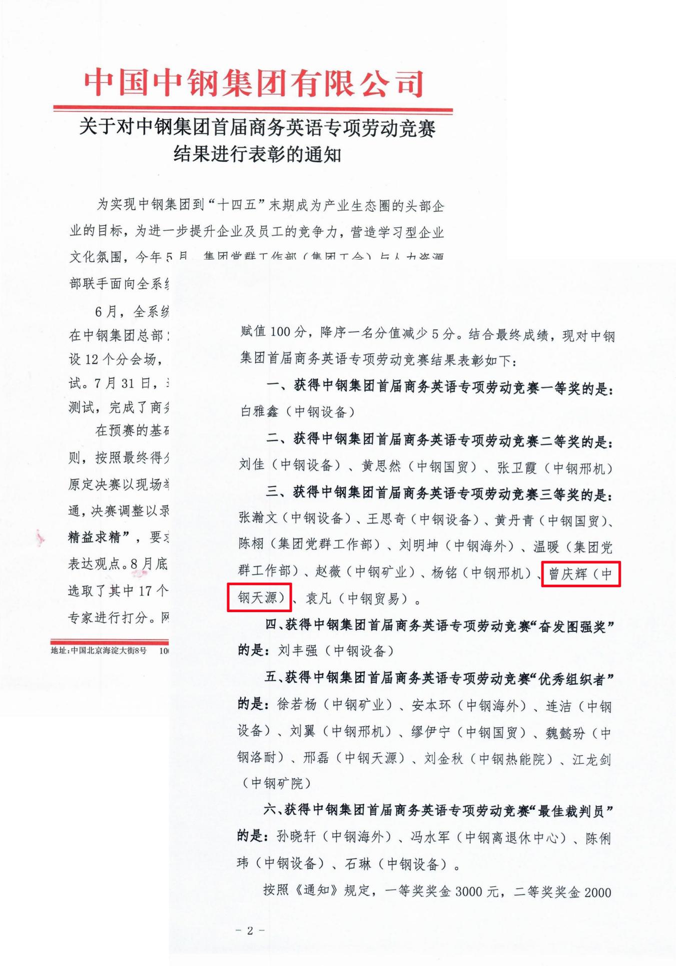 中鋼天源1人榮獲中鋼集團(tuán)首屆商務(wù)英語專項(xiàng)勞動競賽三等獎