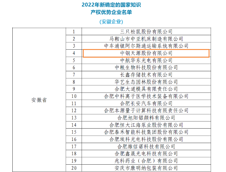 中鋼天源成功入選“2022年度國家知識產(chǎn)權(quán)優(yōu)勢企業(yè)”名單