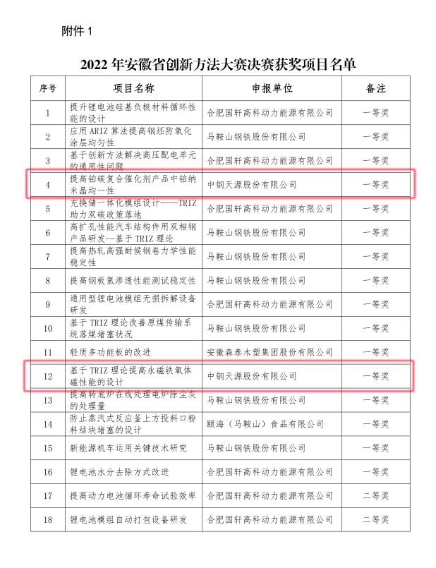中鋼天源兩項(xiàng)目斬獲2022年安徽省創(chuàng)新方法大賽一等獎