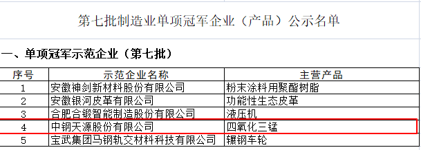 中鋼天源榮獲 “第七批制造業(yè)單項(xiàng)冠-軍示范企業(yè)”
