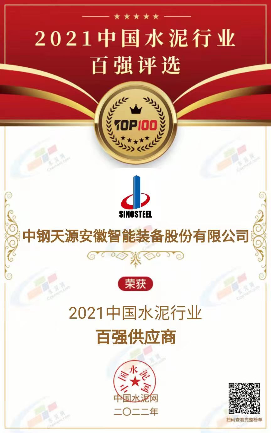中鋼天源子公司獲“2021中國水泥行業百強供應商”榮譽稱號