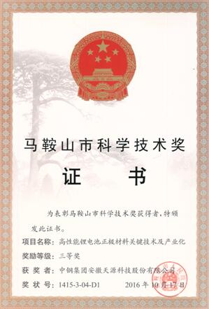 會議宣讀了《馬鞍山市人民政府關于2014-2015年度馬鞍山市科學技術獎勵的決定》,中鋼天源駱艷華、楊洋、裴曉東等同志承擔的省科技攻關項目《高性能鋰電池正極材料關鍵技術及產業化》獲得“馬鞍山市科技進步三等獎”。