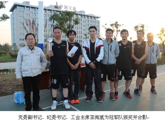 11月11日下午,中鋼天源第七屆職工籃球聯賽在隆重的頒獎儀式中落下帷幕,公司黨委副書記、紀委書記、工會主席亞海斌到場觀看比賽并為冠軍頒獎。公司副總經理余進、董事會秘書章超分別為亞軍、季軍頒獎。